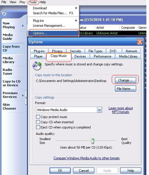 இனி நீங்கள் செய்யவேண்டியது Tools ->Options கிளிக்கி திறக்கும் பாப் அப் விண்டோவில் Copy Music என்கிற டேப் திறந்து அதில் Change என்பதில் கிளிக்கி பாடல்களை சேமிக்க விரும்பும் இடத்தை பிரவுஸ் செய்து ஓக்கே கொடுத்து வெளியேறவும் சந்தேகத்திற்கு படத்தை பார்க்கவும்.